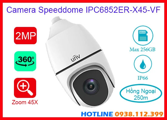 IPC6852ER-X45-VF là dòng camera Speeddome có thể lắp đặt ngoài trời chống nước IP 66, ống kính có thể zoom siêu xa lên đến 45X, khả năng giám sát vào ban đêm cực kì ấn tượng bằng hồng ngoại Smart IR lên đến 250m, chống ngược sáng WDR 120db
