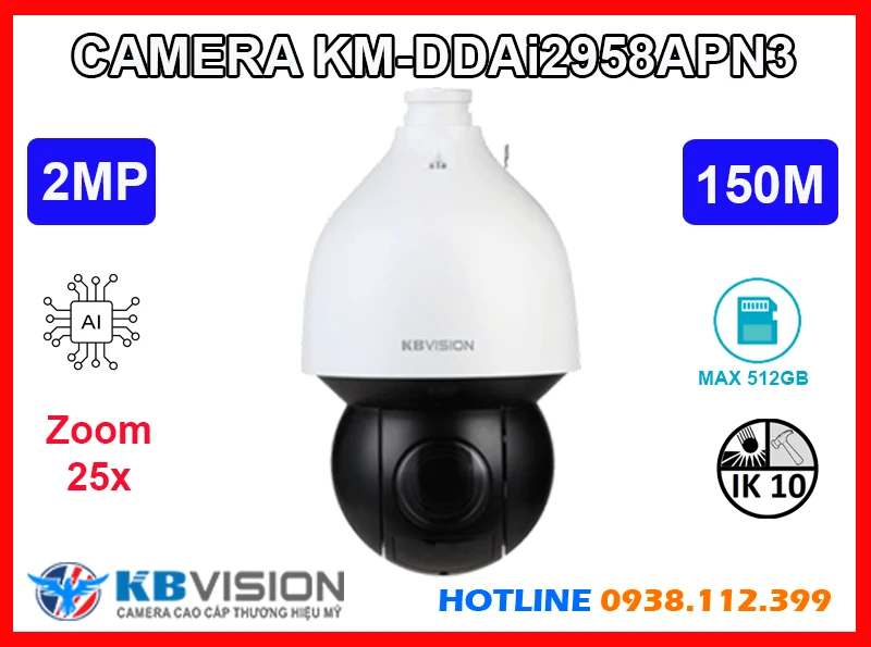 Camera KM-DDAi2958APN3 của KBVISION là dòng PTZ 2MP cao cấp tích hợp AI hiện đại giúp nhận diện thông minh và giám sát hiệu quả. Với khả năng quay xoay 360 độ, zoom quang 25x và tầm nhìn hồng ngoại 150m, camera đảm bảo hình ảnh sắc nét trong mọi điều kiện. Hỗ trợ khe cắm thẻ nhớ 512GB, là giải pháp an ninh lý tưởng cho các công trình quan trọng.