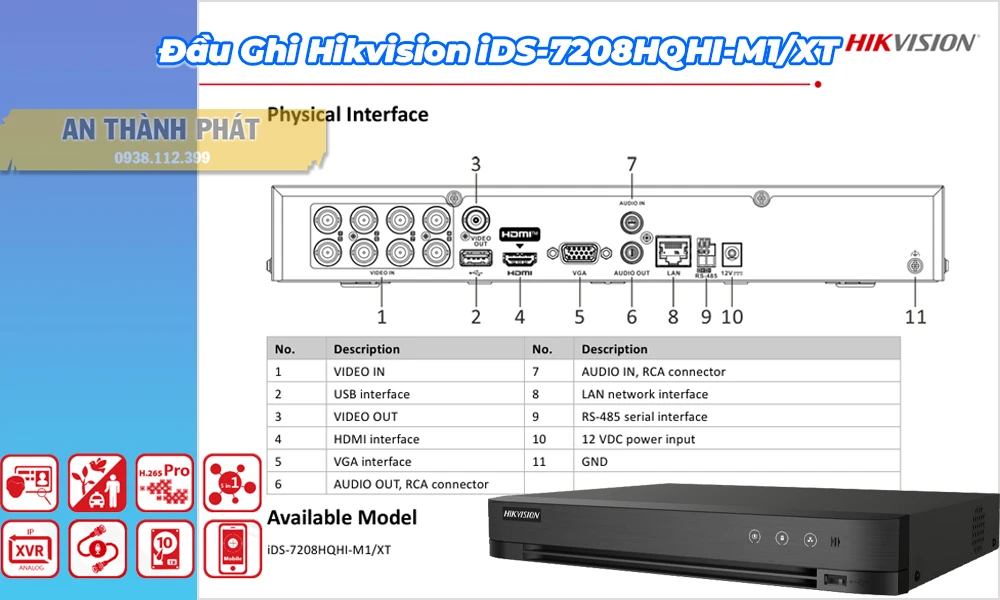 Công ty camera An Thành Phát là địa chỉ tin cậy cung cấp Thiết bị thu hình chất lượng. Được biết đến với sản phẩm Đầu Ghi Hình 8 Kênh iDS-7208HQHI-M1/XT và dịch vụ Giám Sát Tập Trung chuyên nghiệp. Với thông số Điện năng tiêu thụ 12V 1.5A, chúng tôi cam kết đem đến sự hài lòng và chăm sóc khách hàng tốt nhất. Hãy để An Thành Phát giúp bạn bảo vệ an ninh cho ngôi nhà hoặc doanh nghiệp của bạn.
